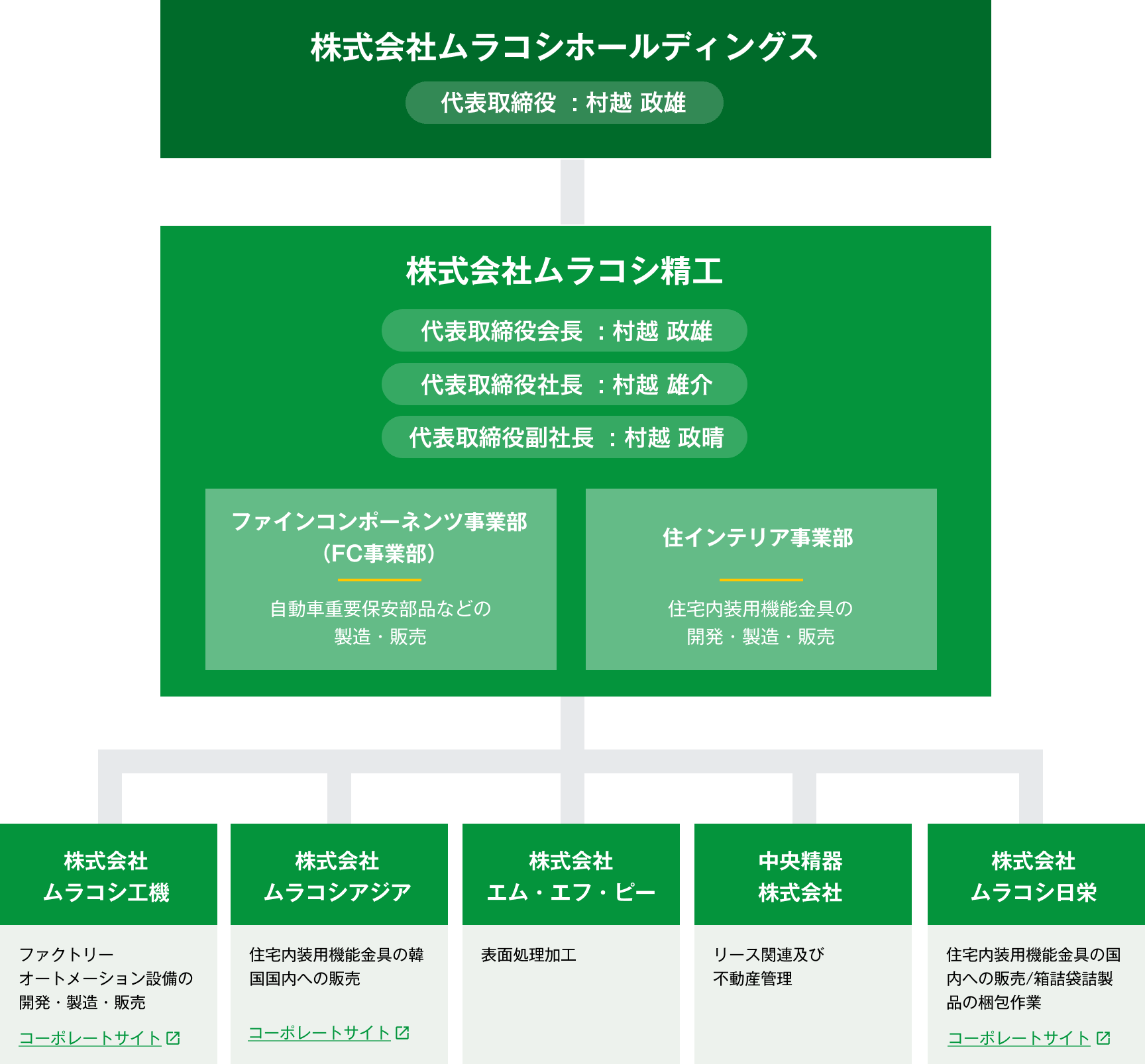 株式会社ムラコシホールディングスは、経営環境の変化が激しくなる中、的確かつ迅速にグループ各社を結集し、一体となりその力を発揮するため、中核会社としての役割を担わせる目的で2014年12月17日に設立しました。